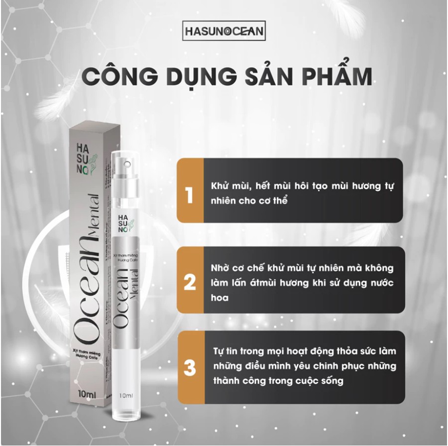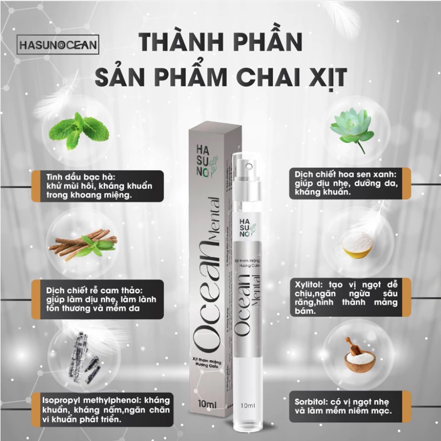 Xịt thơm miệng Ocean Mental với thành phần chính từ thiên nhiên an toàn như tinh dầu bạc hà, chiết xuất rễ cam thảo và hoa sen xanh giúp làm sạch răng, miệng, kháng khuẩn, làm dịu mát khoang miệng, khử mùi hôi miệng và giúp cho hơi thở thơm mát. Xilitol và Sorbitol giúp bảo vệ nướu, góp phần ngăn ngừa sự phát triển của vi khuẩn trong khoang miệng, giúp bạn tự tin trò chuyện mỗi ngày, chinh phục những mục tiêu mới.