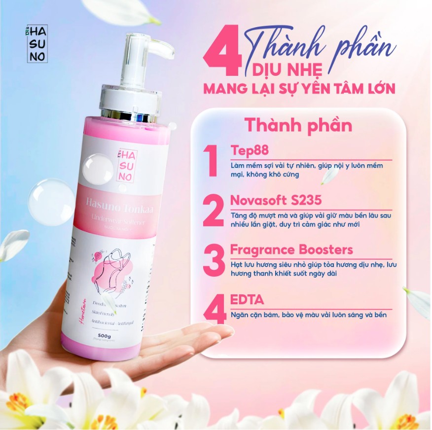 Mỗi thành phần đóng vai trò quan trọng trong việc làm mềm vải, giúp mùi thơm bám lâu nhưng không gây kích ứng. Đây cũng là một trong những ưu điểm giúp Tonkaa được nhiều chị em tin chọn trong việc chăm sóc đồ nội y hằng ngày.