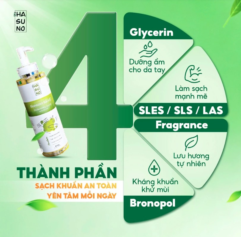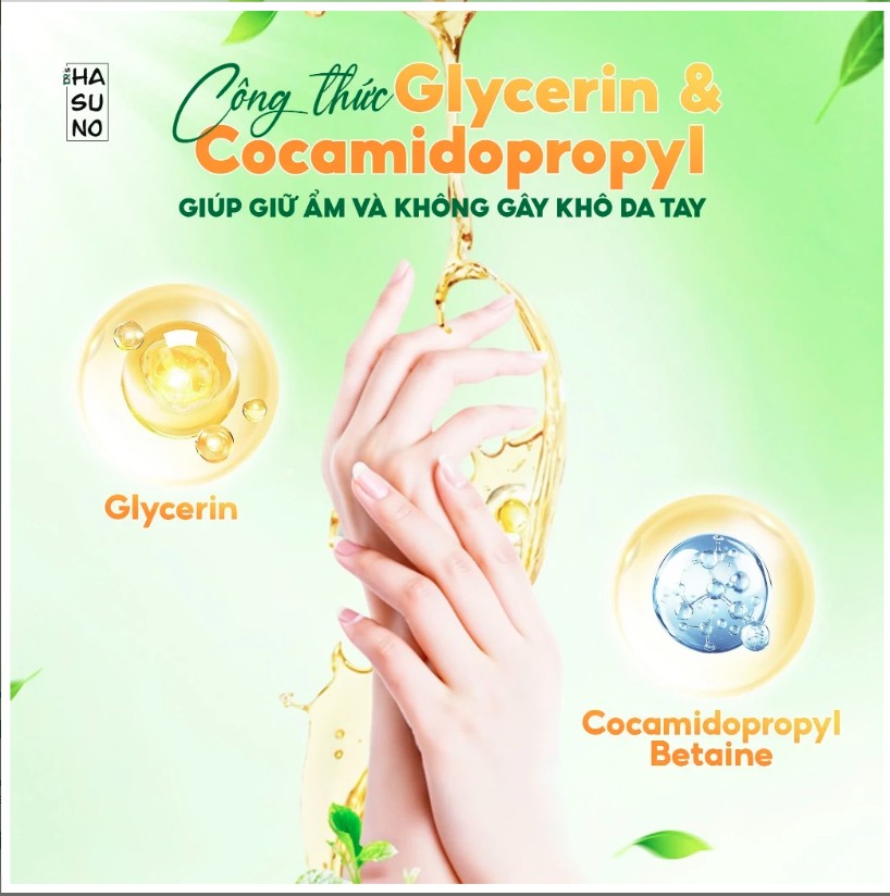 Glycerin: Giúp dưỡng ẩm, bảo vệ da tay mềm mại trong quá trình rửa.