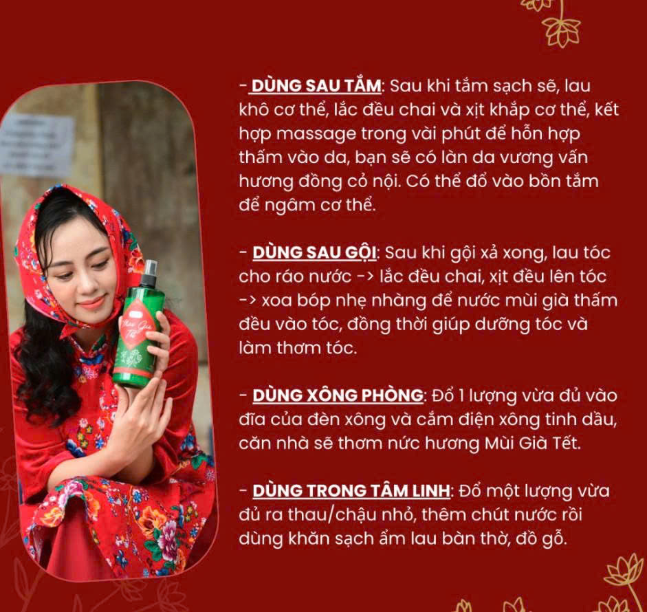 Tinh dầu, Hydrosol và Glycerin trong sản phẩm MÙI GIÀ TẾT Bimore là dưỡng chất giúp da và tóc mềm mại, thơm vương vấn hương đồng gió nội.