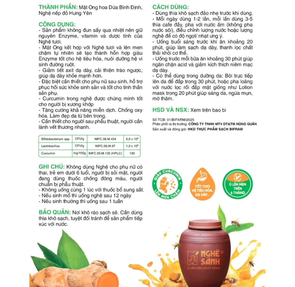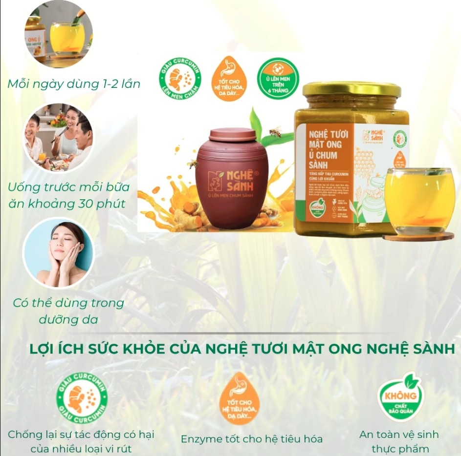 - Mật Ong kết hợp với Nghệ tươi và lên men chậm tự nhiên sẽ tạo thành hỗn hợp giàu Enzyme tốt cho hệ tiêu hóa, nuôi dưỡng hệ vi sinh đường ruột.