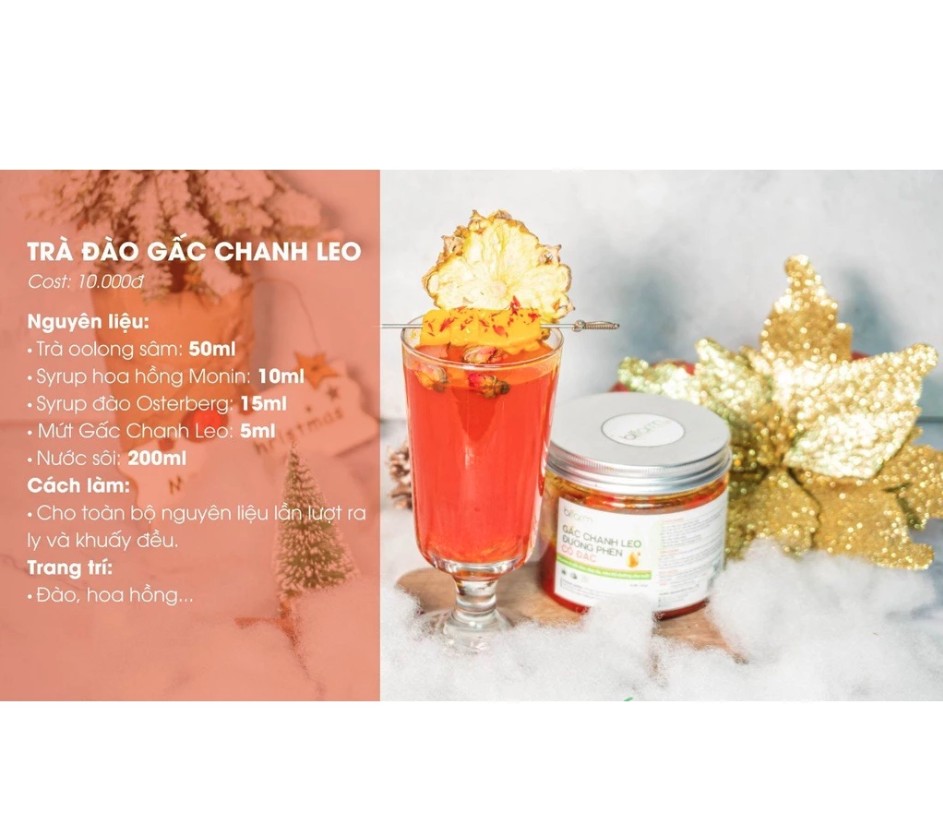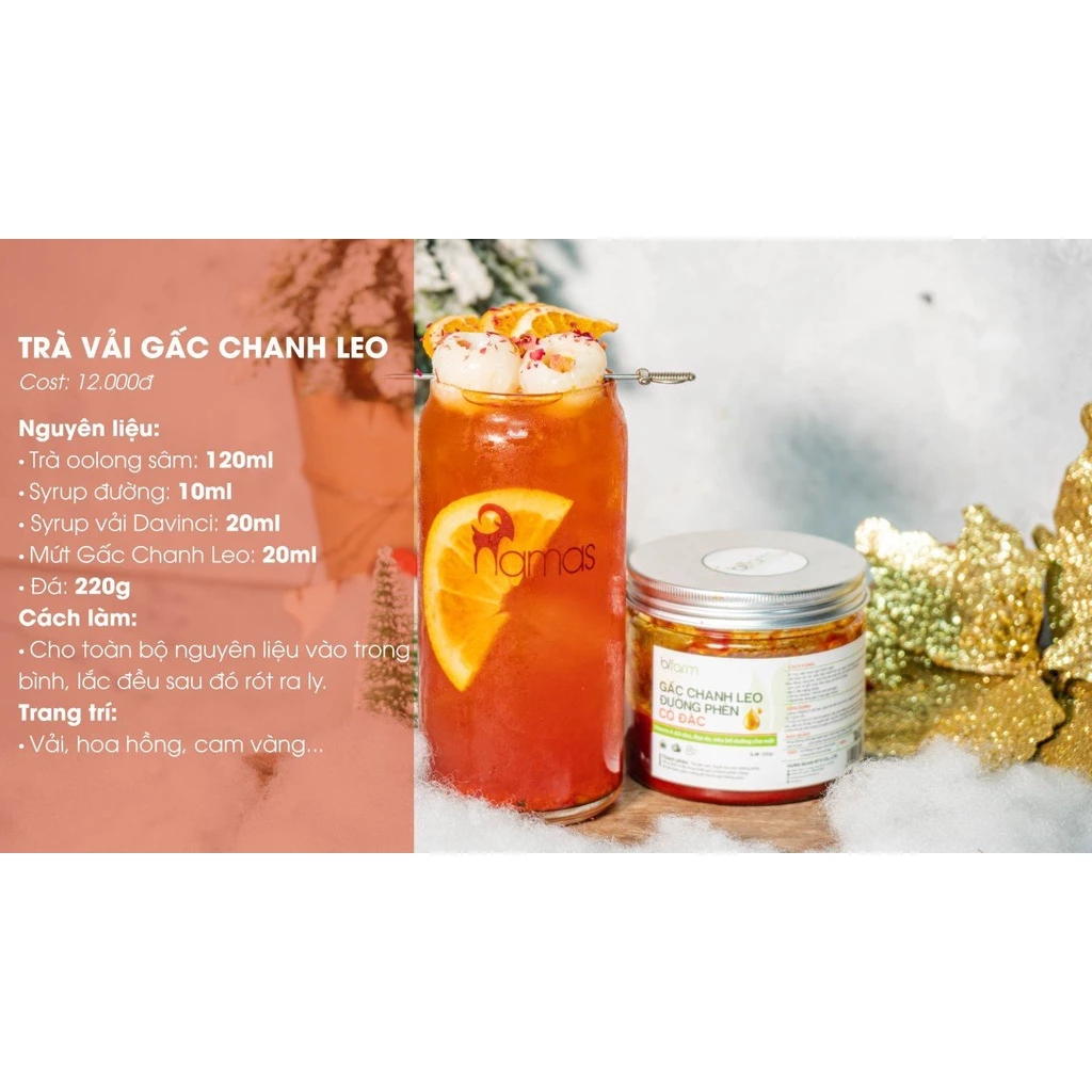 Thành phần: Thịt gấc tươi, chanh leo tươi, đường phèn. Tất cả được cô đặc trong nhiều giờ, ra thành phẩm những hũ Gấc thơm ngon, miếng gấc thanh ngọt đường phèn.
