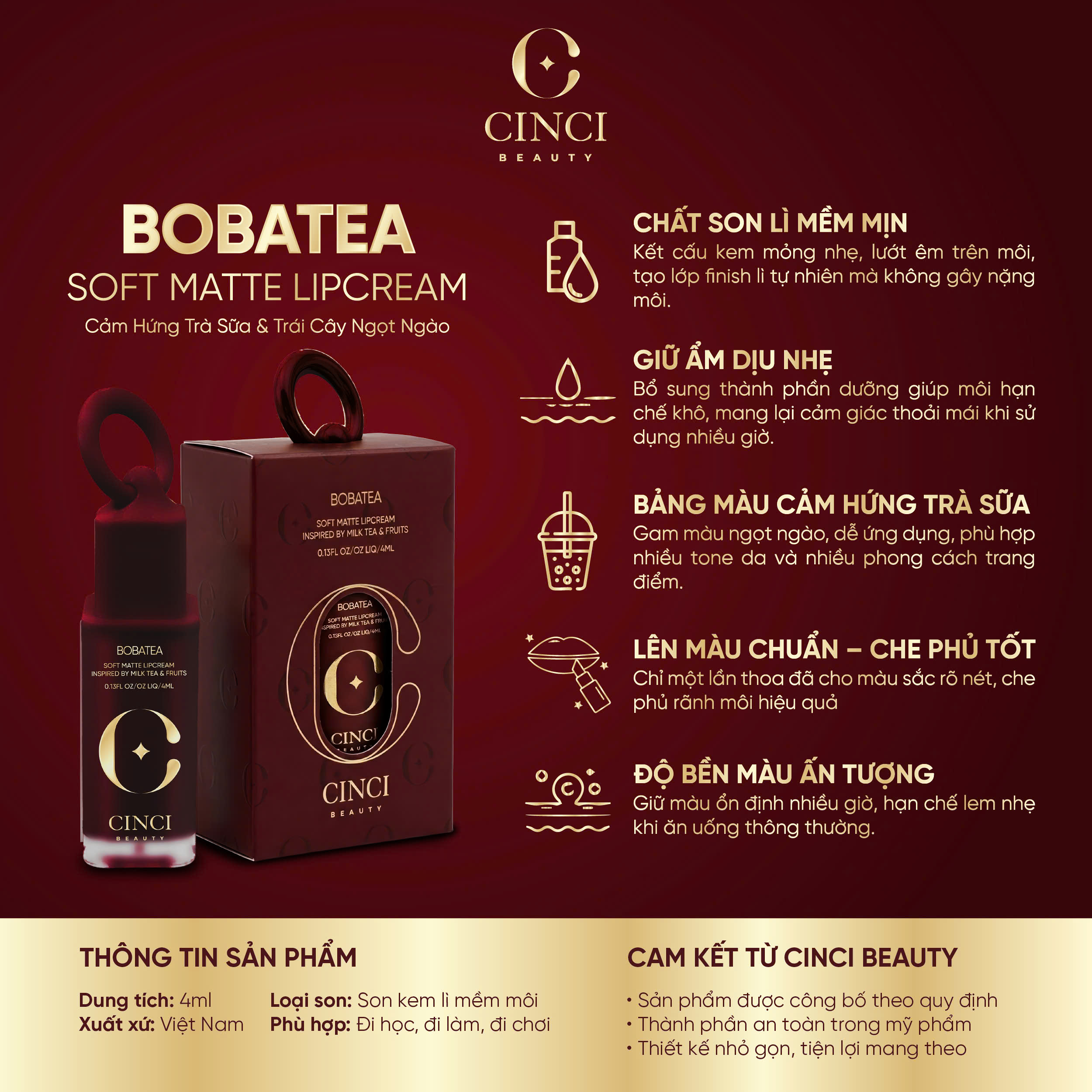 - Chất son lì mềm mịn: kết cấu kem mỏng nhẹ, lướt êm trên môi, tạo lớp finish lì tự nhiên mà không gây nặng môi